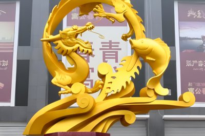 鱼跃龙门雕塑通常以灵动的鱼奋力跃过龙门的形象,展现积极向上、追求成功的设计理念。